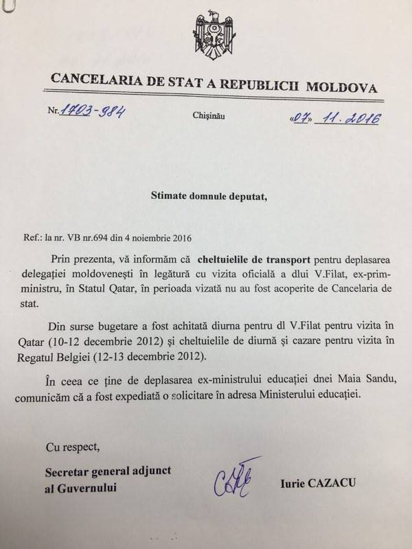 В частности, Додон представил ответ Государственной канцелярии, в котором говорится о том, что поездка молдавской делегации не оплачивалась из государственного бюджета. Деньги из госказны были выделены только на командировочные и проживание Влада Филата.