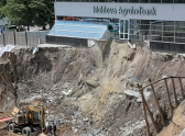Как сегодня выглядит место, где вчера рухнул грунт, можно увидеть в фоторепортаже ниже.