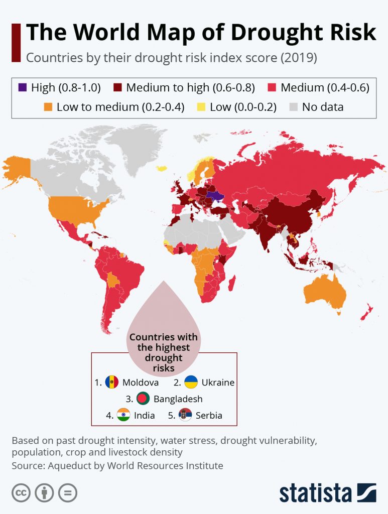 По данным Института мировых ресурсов, всего в списке - 138 государств. Как пишет портал Diez.md, cпециалисты проанализировали интенсивность прошлой засухи, наличие дефицита воды, поражения от засухи, численность населения, объем посевов и поголовье скота. В топ-5 рейтинга также попали Украина, Бангладеш, Индия и Сербия.