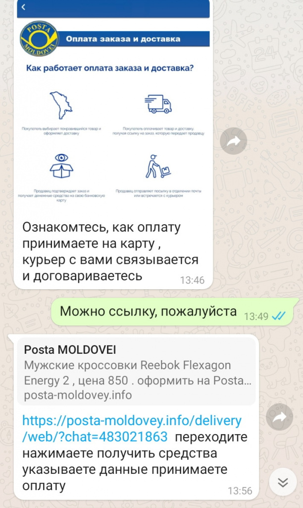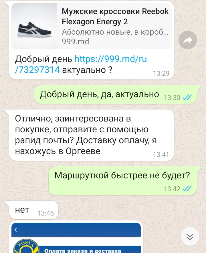 - Заказывал я обувь с иностранного сайта, но, как бывает иногда, размер не подошел. Решил подать объявление о продаже на известном сайте. Мне написала некая личность и пожелала купить данный товар, но с условием, что я отправлю его в Оргеев через курьерскую службу Почты Молдовы.
