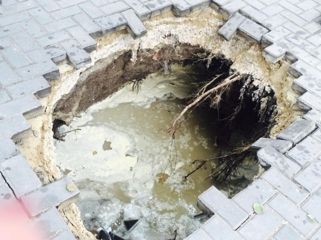 Фотографии свидетельствуют, что провал достаточно глубокий и наполнен водой. Судя по всему, вода подмыла почву и под весом автомобиля произошел обвал.