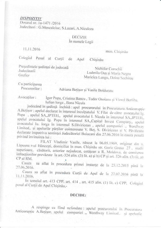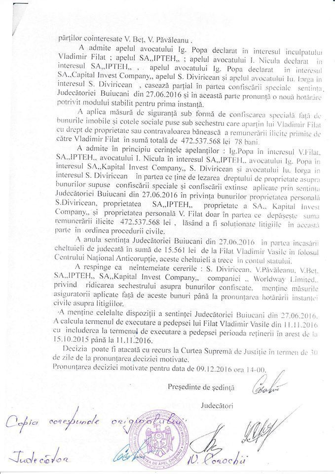 В нем, в частности, говорится о том, что судьи частично оставили в силе решение суда сектора Буюканы и вынесли новое решение по делу Филата.