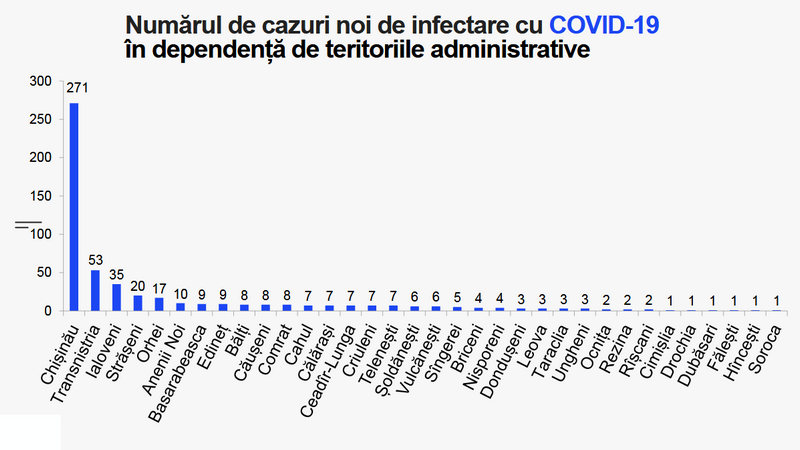 Три случая были импортированы - из Египта, США и Украины. Остальные – результат местной передачи. Наибольшее число инфицированных по-прежнему в Кишиневе – 271 человек.