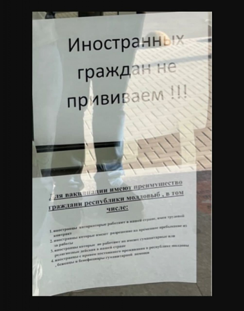 Медицинские учреждения Кишинева объявляют о невозможности иностранцам вакцинировать от коронавируса. Подобная бумажка приклеена к парадной двери центра вакцинации на улице Петру Рареша (бывшая Павловская), сообщает Sputnik.