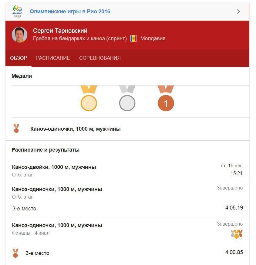 Каноист Сергей Тарновский, выступающий за Молдову на Олимпийских играх в Рио-де-Жанейро, выиграл первую медаль для нашей страны - бронзовую.