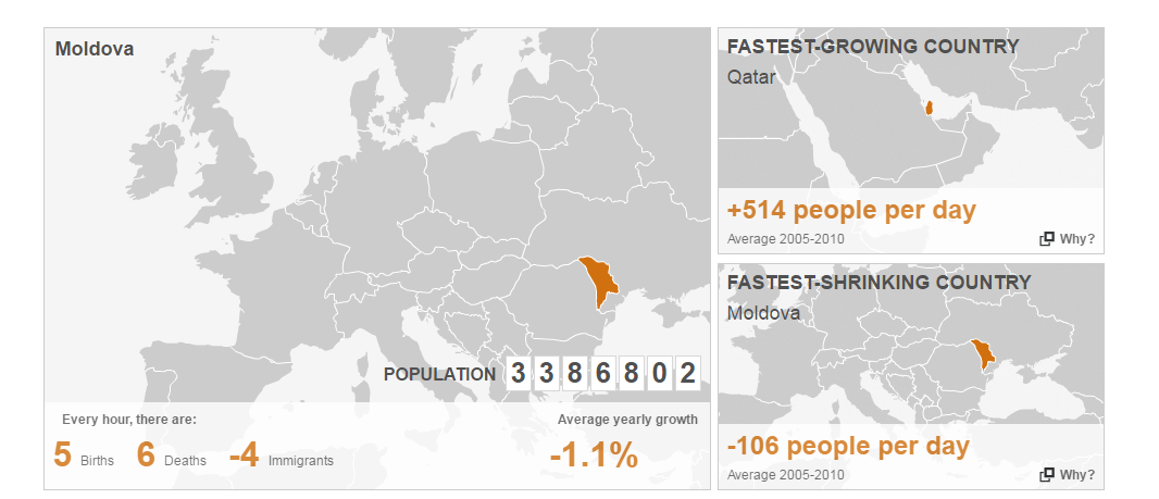 Согласно информации источника, население нашей республики составляет 3386802 человека. Мы относимся к числу стран, резко теряющих свое население: в среднем, с 2005 по 2010 годы каждый день Молдову покидало по 106 человек. Каждый час в нашей республике рождаются 5 человек, а умирает 6, свидетельствуют представленные данные.