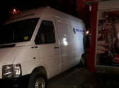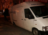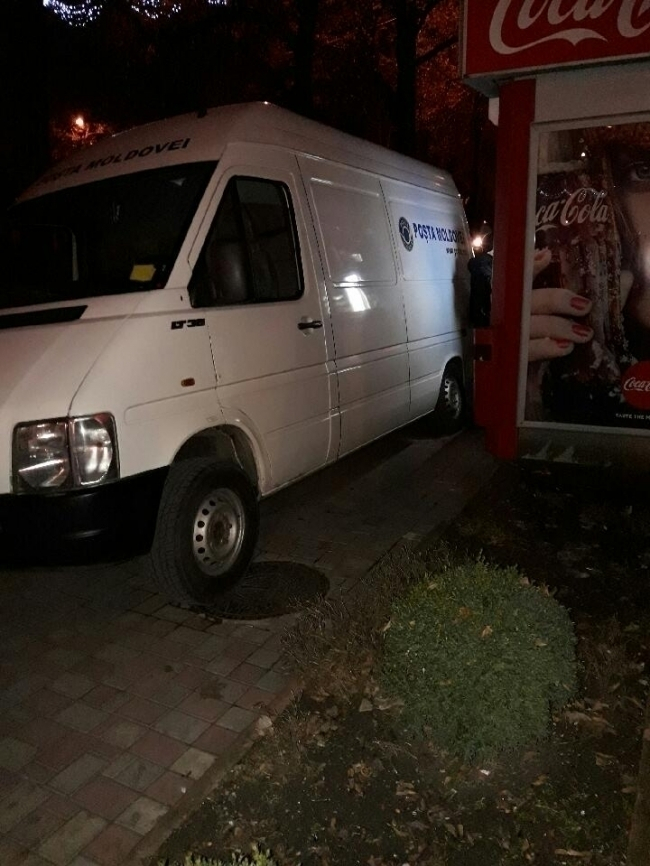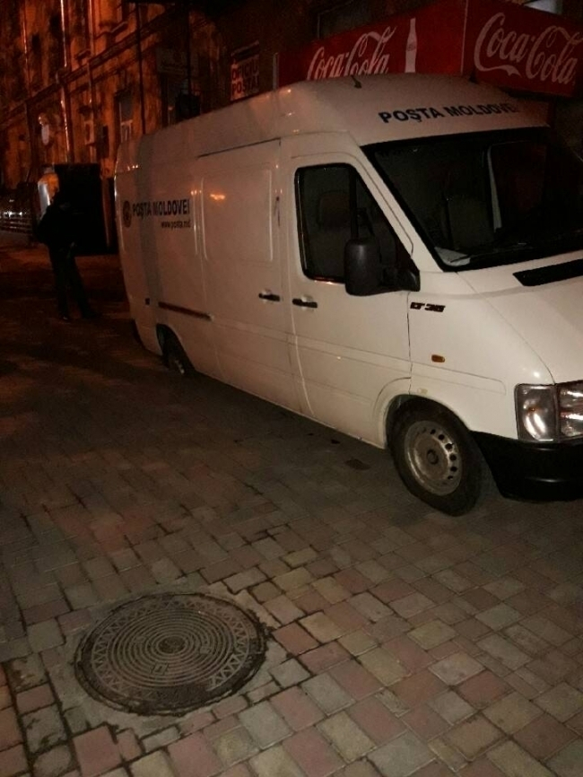 Микроавтобус ГП "Почта Молдовы", заехавший на тротуар для разгрузки, провалился одним колесом в яму от просевшей плитки.