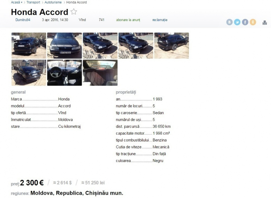 Согласно объявлению, за машину с пробегом в 36 650 километров хозяин хочет 2 300€.